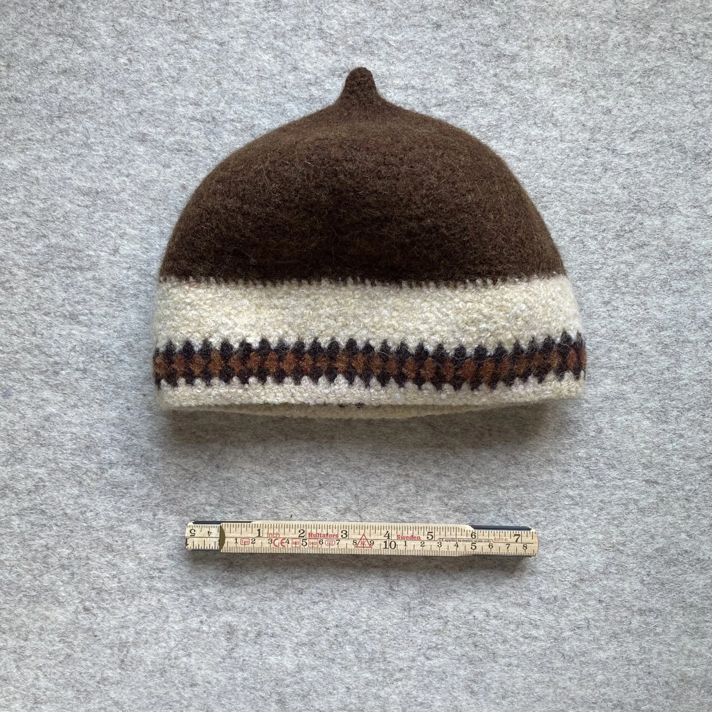 Choose from my ready-made designs just as they are. Pattern and stripe placement remain as shown on the original hat, but you can select your own colours from my felted samples to make it your own.